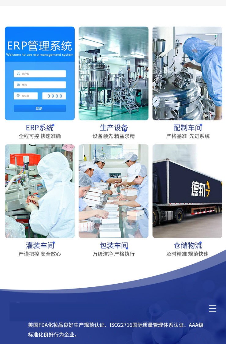 公司廠區(qū)環(huán)境優(yōu)美,廠房面積超10000平方米,生產(chǎn)車間環(huán)境完全按照GMPC認(rèn)證所需要的條件建設(shè),并一次性通過 “GMPC”認(rèn)證。公司目前擁有多條現(xiàn)代化的生產(chǎn)線,多臺(tái)/套國際、國內(nèi)先進(jìn)乳化、自動(dòng)灌裝、滅菌、檢驗(yàn)檢測等儀器,具備各類膏霜、洗護(hù)、美容化妝產(chǎn)品的生產(chǎn)條件和能力,年生產(chǎn)能力可達(dá)到數(shù)千萬支,同時(shí)工廠不僅能生產(chǎn)各種形態(tài)、規(guī)格、品種的化妝品,還能提供化妝品所有常規(guī)檢驗(yàn)項(xiàng)目的檢測報(bào)務(wù),全方位保證企業(yè)的產(chǎn)品在消費(fèi)者手中的安全使用,讓消費(fèi)者放心消費(fèi)。 工廠自投產(chǎn)以來,嚴(yán)格按國家各項(xiàng)政策、法規(guī)實(shí)施經(jīng)營管理,積極進(jìn)取,求實(shí)創(chuàng)新。嚴(yán)格執(zhí)行質(zhì)量體系的同時(shí)按GMPC要求組織日常全過程生產(chǎn),使每一支驗(yàn)收合格的產(chǎn)品,在市場上讓不同地區(qū)的消費(fèi)者滿意,從而讓企業(yè)贏得更多消費(fèi)者的青睞...